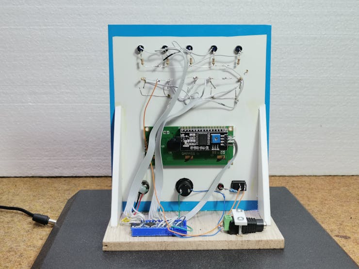 我们有五个以随机顺序和间隔点亮的蓝色 LED。在每个 LED 下方是一个光敏电阻,它实际上是一个目标。游戏的目标是用激光指示器发出的光束射在活动 LED 下的 LDR(目标)。一旦你点击这个 LDR,相应的 LED 就会熄灭。