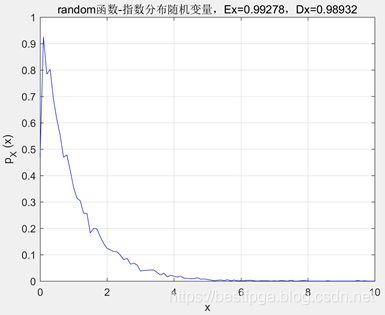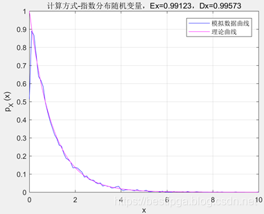 plot(x,nznorm,'b'); title('计算方式-指数分布随机变量,Ex='... +string(Ex)+',Dx='+string(Dx));