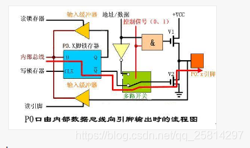 下图就是由内部数据总线向P0口输出数据的流程图(红色箭头)。