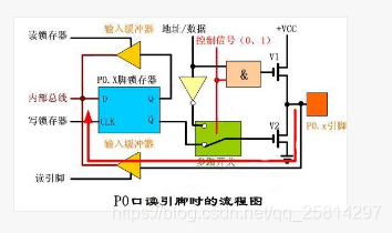 读芯片引脚上的数据,读引脚数时,读引脚缓冲器打开(即三态缓冲器的控制端要有效),通过内部数据总线输入,请看下图(红色简头)。