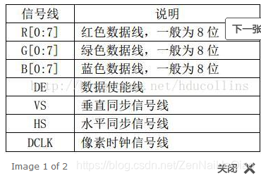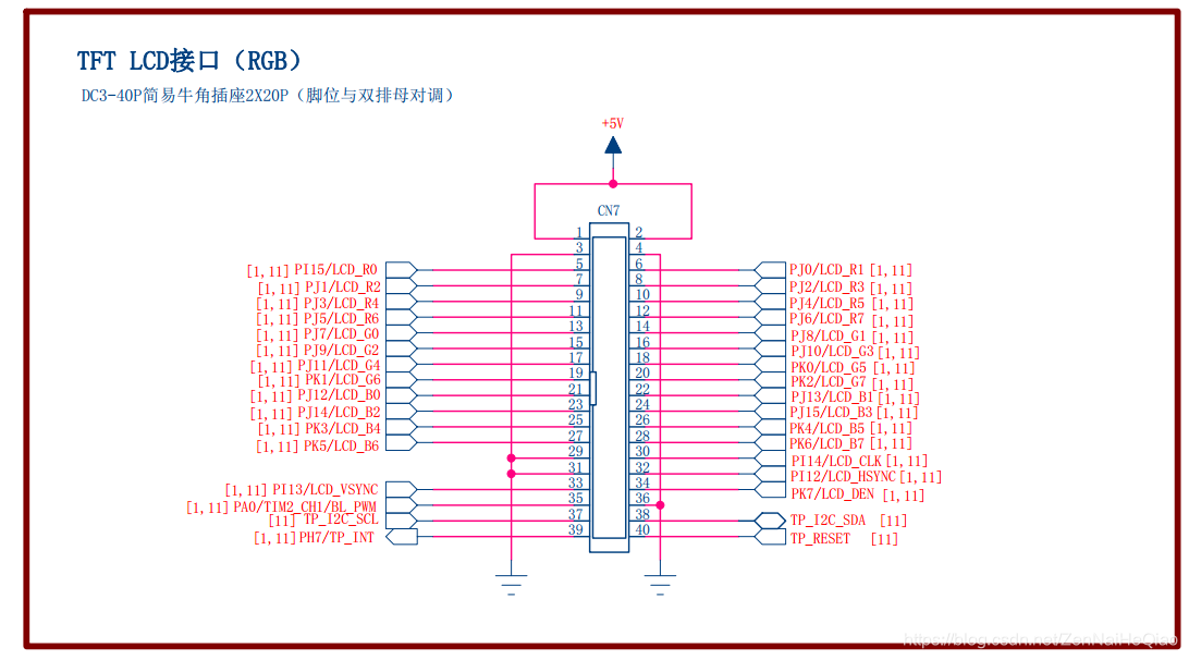 TFT液晶显示器使用的是RGB接口,RGB接口包含24根RGB信号线、像素同步信号线、水平同步信号线、垂直同步信号线和数据使能信号线。