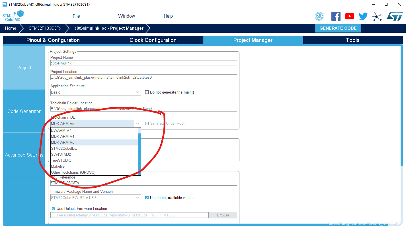在project manager里面选择正确的编译工具 MDK-ARM v5
