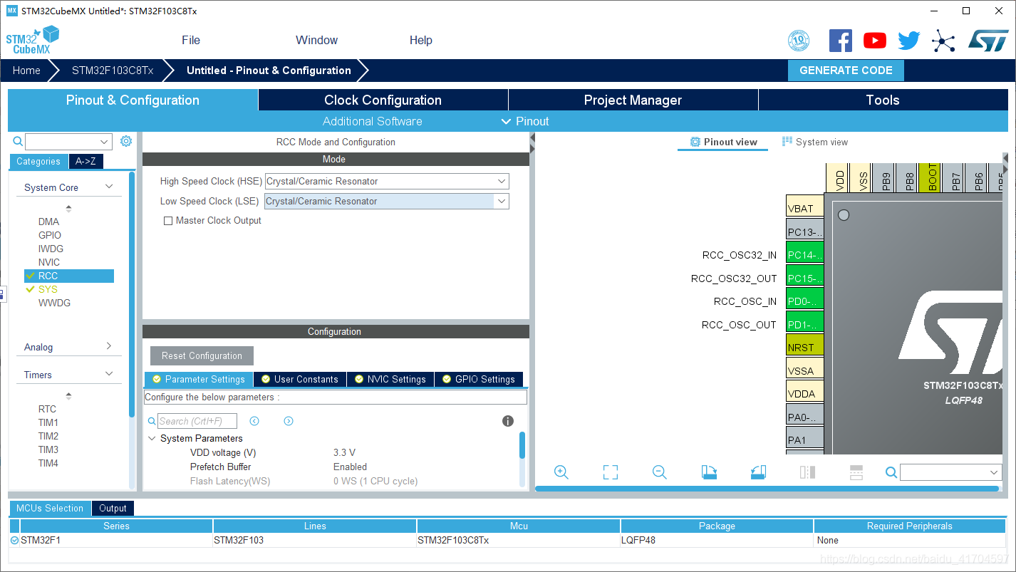 点开 pinout&configuration,点开左侧目录树的SYS,配置debug口(这里使用的是st-linkv2)