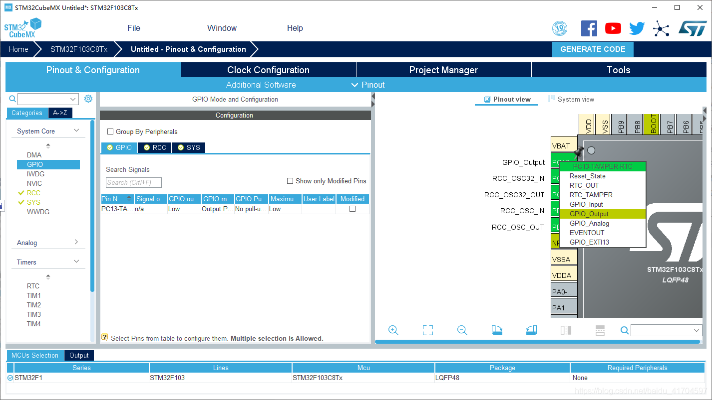 右键PC13(此处应该参考单片机上哪个管脚对应了led灯),配置gpio output
