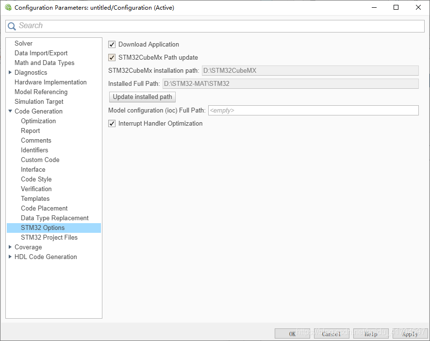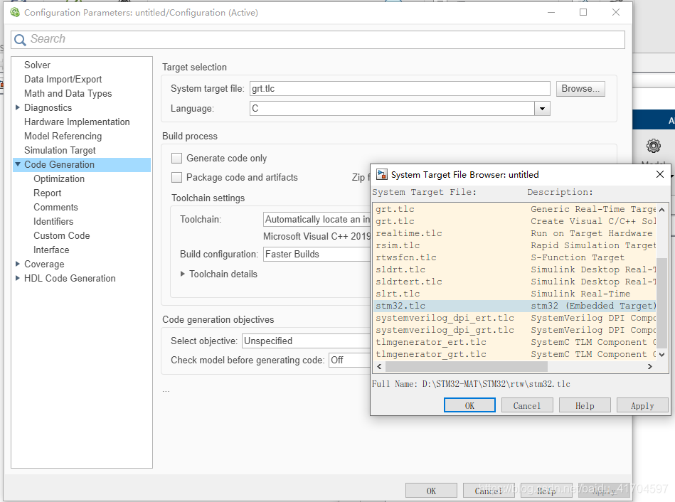 code generation——》system target file——》stm32.tlc——》OK