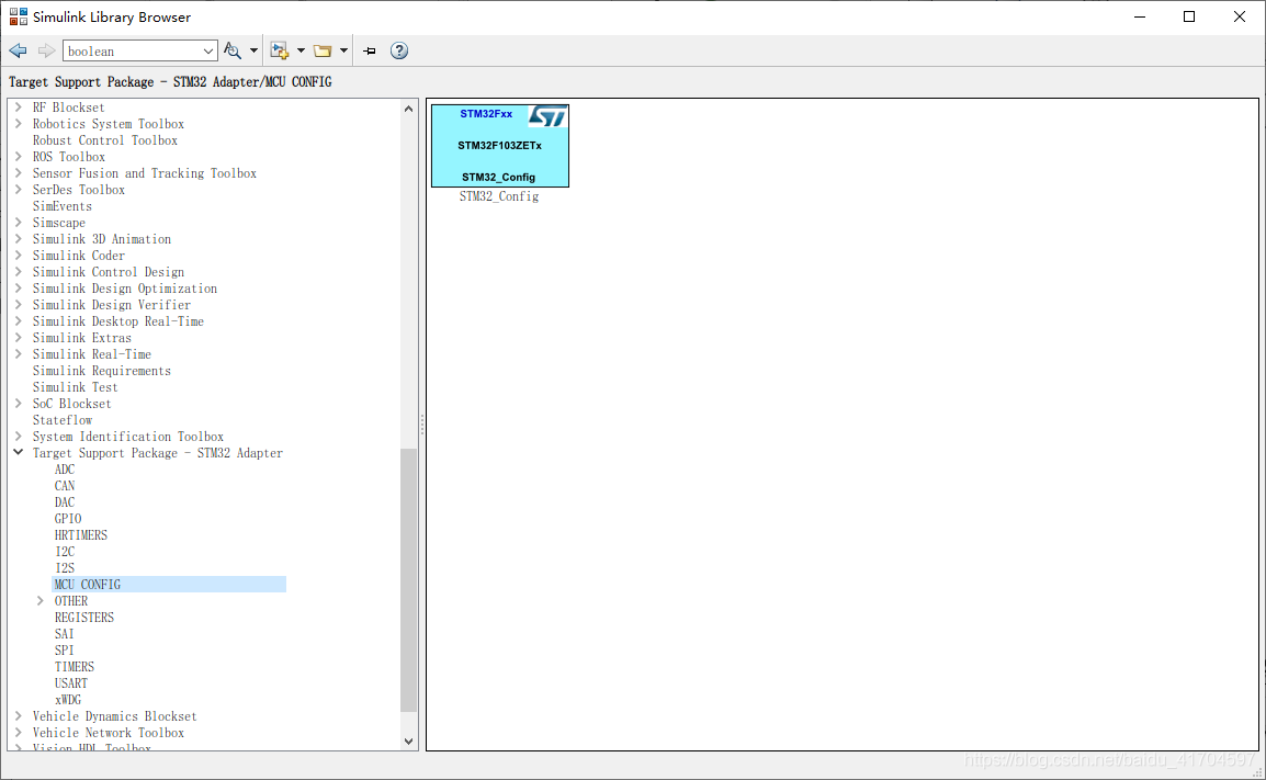 打开配置好的simulink窗口,找到library中的stm32部分,把stm32_config拖进去