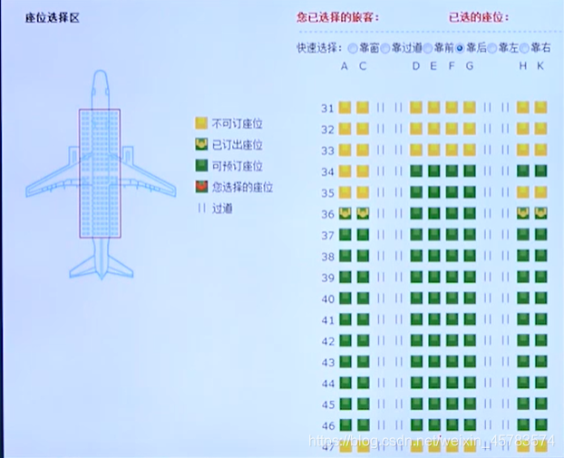 在上图中很好理解,当我们订机票的时候,黄色区域表示已出售的座位(不可占用),绿色区域表示未出售的座位(空闲)。通过这种方法,哪里的座位空闲,哪里的座位已售一目了然。