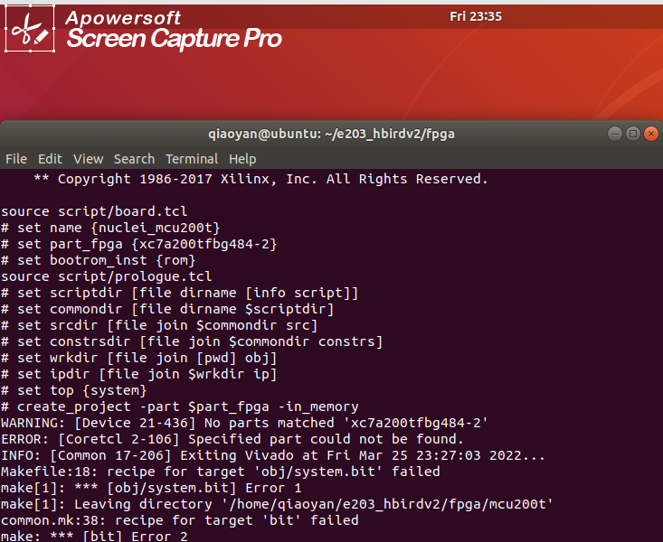 mcu200t开发板在使用make bit产生bit文件时报错如何解决?